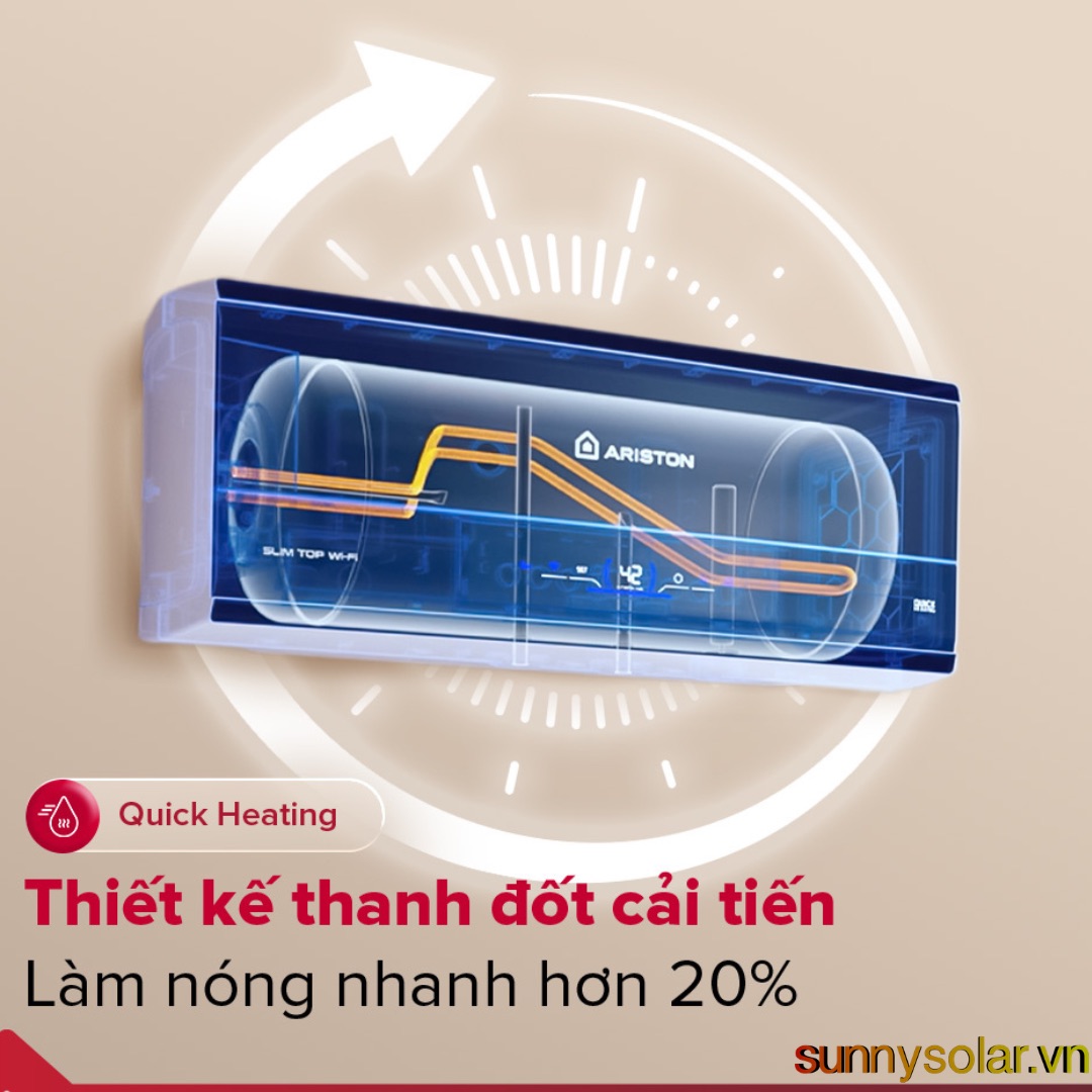 Safety Check là tính năng rà soát an toàn chủ động của bình nước nóng Ariston Slim3. Hệ thống này tự động kiểm tra các yếu tố an toàn như rò rỉ điện, rò rỉ nước, và nhiệt độ vượt mức, đảm bảo an toàn tuyệt đối cho người sử dụng. Bạn hoàn toàn có thể yên tâm tắm thư thái mà không lo lắng về sự cố hay nguy hiểm. - Quick Heating – Làm Nóng Nhanh Hơn 20%