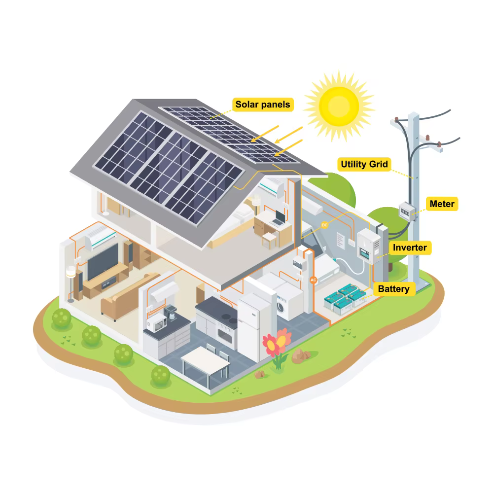 Hệ thống điện mặt trời hybrid là sự kết hợp giữa hệ thống điện mặt trời hòa lưới và điện mặt trời độc lập, sử dụng tấm pin mặt trời, bộ biến tần hybrid và pin lưu trữ để cung cấp điện. Hệ thống này cho phép ưu tiên sử dụng điện mặt trời, lưu trữ năng lượng dư thừa vào pin và vẫn có thể kết nối với lưới điện quốc gia để bù đắp khi cần thiết. Điều này giúp đảm bảo nguồn điện ổn định, tiết kiệm chi phí và có điện dự phòng khi mất điện lưới.