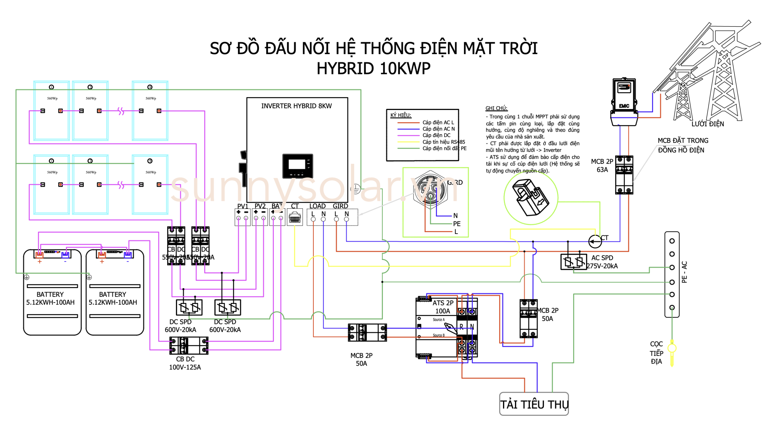 Bản vẽ và sơ đồ nguyên lý của hệ thống điện mặt trời Hybrid như sau: