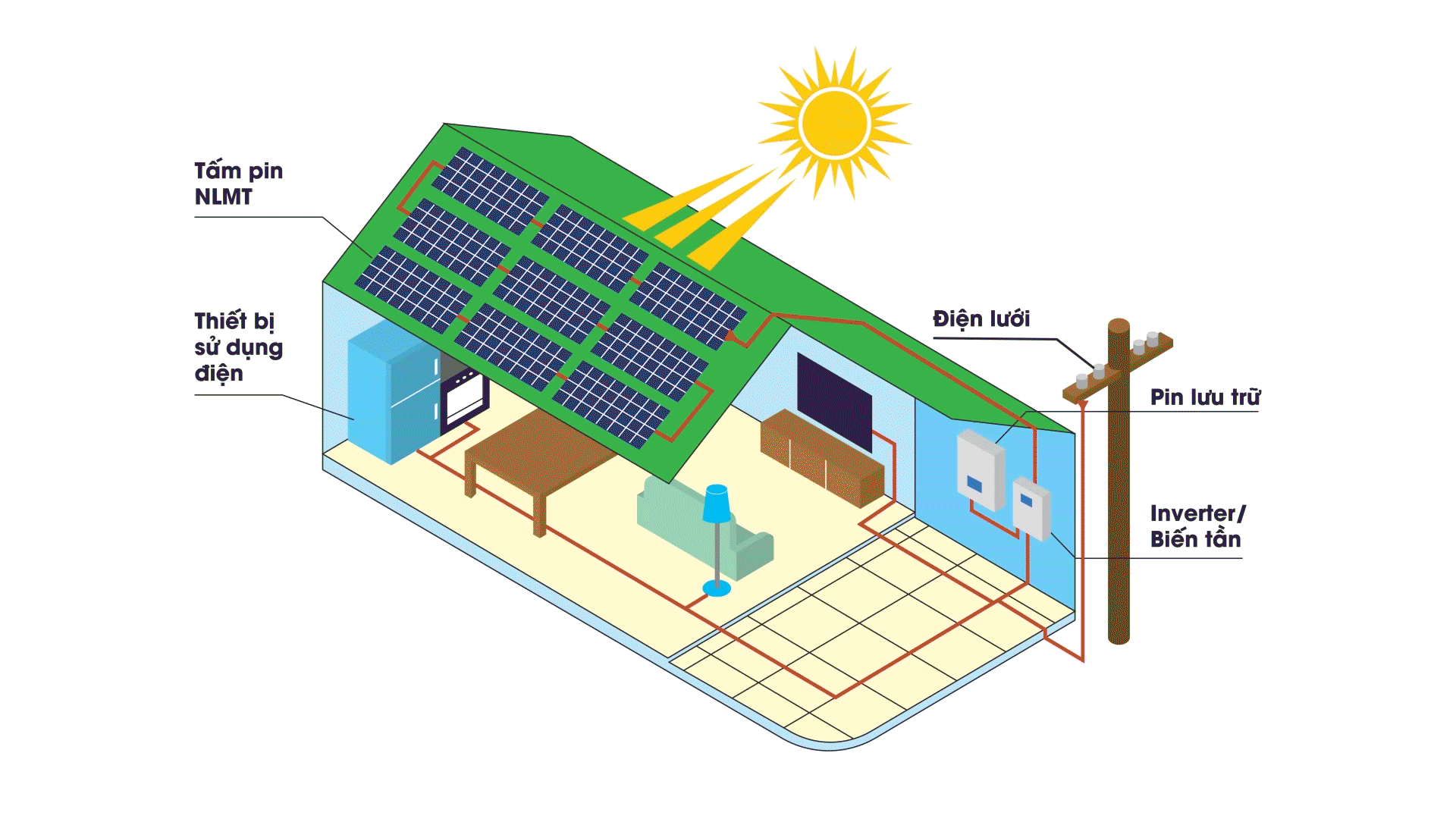 - Đảm bảo nguồn điện dự phòng: Với hệ thống lưu trữ điện, người dùng có thể sử dụng điện năng tích trữ trong trường hợp mất điện hoặc trong những khoảng thời gian không có ánh sáng mặt trời.